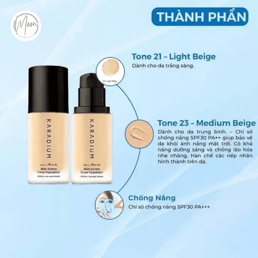 Với kết cấu kem lỏng nhưng giàu sắc tố, Karadium dễ dàng "xóa sổ" các nốt mụn đỏ, vết thâm sạm và vùng da không đều màu. Lớp nền mỏng mịn nhưng lại có khả năng che phủ tương đương với các dòng kem nền chuyên nghiệp.